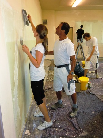 Mit den beiden Malergesellen Erich Gäßler und Rolf Müller hatten erfahrene Mitarbeiter die Leitung des Berufsprojekts übernommen. Unterstützt wurden sie von Sahar Mironow und Christian Sali, jeweils Auszubildende im ersten und zweiten Lehrjahr. „Uns ist es ein Anliegen, dass die Jugendlichen von Anfang bis Ende in die Baumaßnahme involviert sind und wir ihnen dabei alle Handgriffe in Ruhe zeigen und erklären können“, betonte Gäßler. Dazu gehörten freilich auch vorbereitende Tätigkeiten wie das Abkleben der Kanten und aufwendige Schutzmaßnahmen für den Boden. Der Raum war durch weitere Schülerhelfer bereits im Vorfeld von altem Mobiliar befreit worden. Dort, wo früher ein voluminöser Einbauschrank Nähmaschinen für den TW-Unterricht schluckte, stapelten sich nun die Arbeitsmittel der Maler. Pinsel, Rollen, Farben, Spachtel, Putzmasse, Eimer, Schleifmaschinen und weitere Gerätschaften wurden draußen vor dem Gebäude einem großen Firmenwagen entnommen.