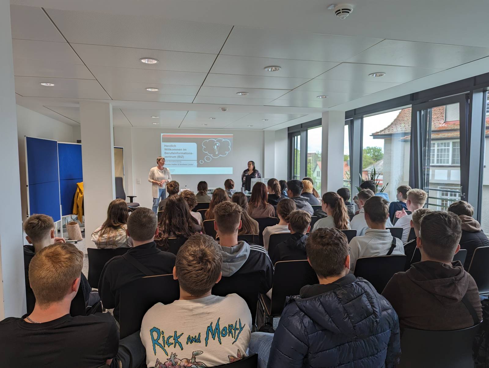 Im BiZ, Berufsinformationszentrum der Agentur für Arbeit in Rottweil, hatten die Schülerinnen und Schüler nun erneut die Gelegenheit, sich ganz intensiv über ihre Berufsfindung Gedanken zu machen. Monika Hattler, die auch wöchentliche Berufsberatung direkt vor Ort in der Schule anbietet, unterstützte die Jugendlichen dabei tatkräftig. So hatten die Schüler die Gelegenheit, sich über ihren (Traum-)Beruf genauer zu informieren sowie mittels eines Szenarios, bei dem sie sich vorstellen sollten, als Gruppe auf einer einsamen Insel gestrandet zu sein, Berufe zu überlegen, die zum Überleben notwendig sind. So stellten die Schülerinnen und Schüler fest, dass es hierzu ganz schön viele verschiedene Berufsbranchen bedarf und jeder Beruf seine Bedeutsamkeit und Wichtigkeit hat.