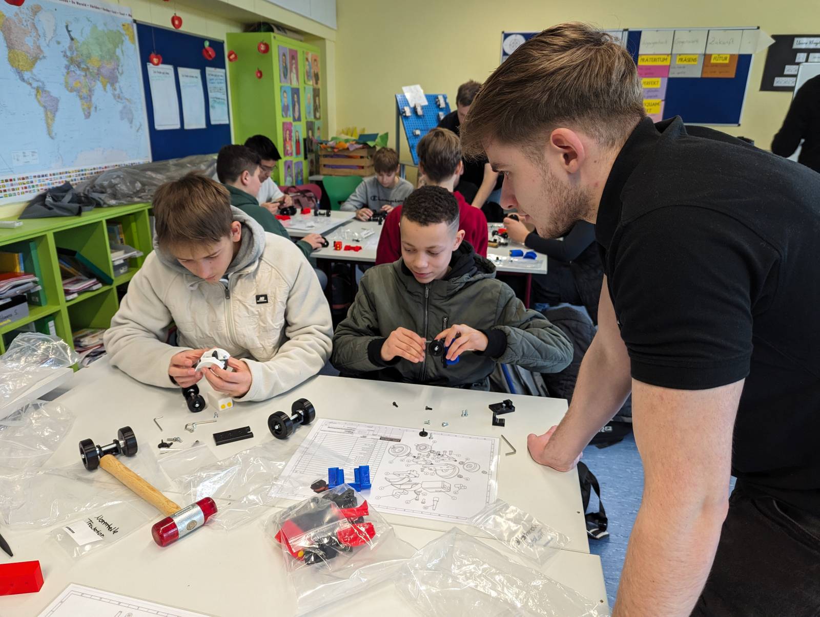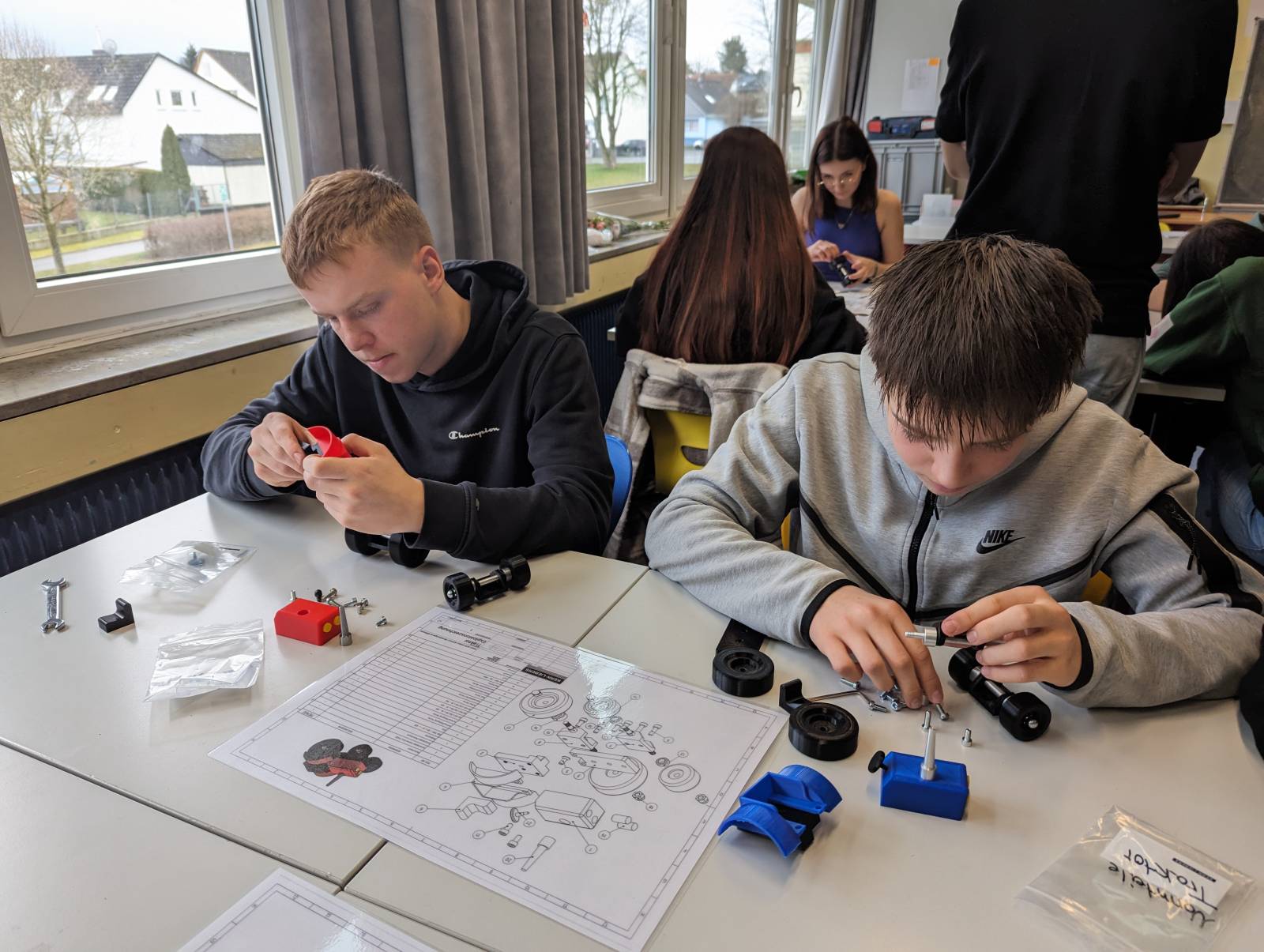 Im zweiten Teil konnten die Schülerinnen und Schüler ins aktive Tun übergehen. Hierzu erhielt jeder Schüler einen Bausatz für einen Traktor, der zuvor von den Auszubildenden entworfen und entwickelt sowie im 3D-Drucker gedruckt wurde. Mit Hilfe einer technischen Zeichnung, die ebenfalls von den Auszubildenden angefertigt wurde, musste nun jeder Schüler den Traktor mittels verschiedenem Werkzeug zusammenbauen. Unterstützt wurden die Jugendlichen hierbei von 6 Auszubildenden, die sich derzeit überwiegend im zweiten Lehrjahr bei Kern-Liebers befinden. So ergab sich eine Win-Win-Situation: die Schüler lernten von den Auszubildenden und die Auszubildenden konnten sich darin üben, andere anzuleiten und den selbst entworfenen und hergestellten Bausatz anschließend reflektieren und weiter optimieren. Alle Beteiligten waren aktiv involviert und hatten Freude am Tun. Nachdem die Jugendlichen fertig waren, hatten sie noch die Gelegenheit, zu beobachten, wie ein 3D-Drucker funktioniert, eine von Azubis selbst hergestellte Pneumatik-Schaltung bestaunen, sowie mittels VR-Brille die Auszubildendenlehrwerkstatt bei Kern-Liebers bestaunen. Bitzer betonte, wie wichtig Spaß an der Arbeit sei und erklärte ebenfalls, weshalb es für einen Betrieb unabdingbar sei, in die Ausbildung zu investieren und sie innovativ immer weiterzuentwickeln.