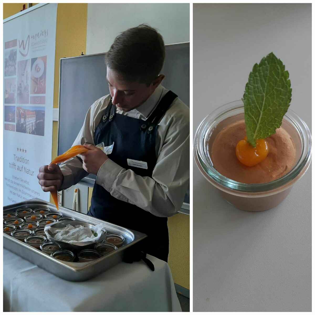 Auch wurde von Seiten der Ausbildungsbotschafter darauf hingewiesen, dass die Möglichkeit bestehe, ein Praktikum und eine Ausbildung in ihrem Hause zu absolvieren. Zum Schluss durften die Schüler eine vom Koch-Azubi selbst hergestellte süße Nachspeise mit Genuss verköstigen.