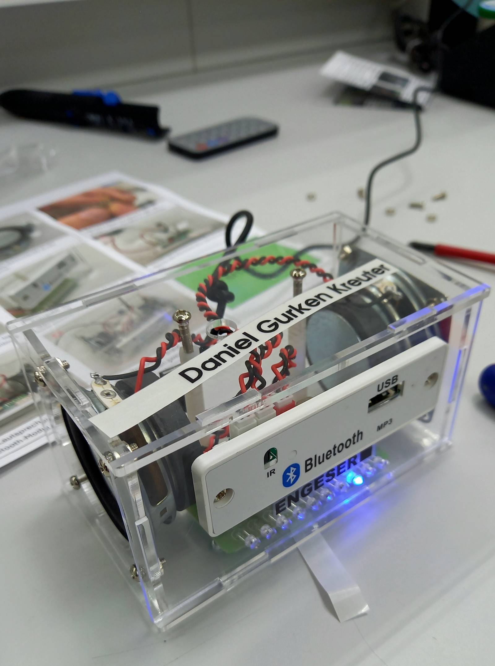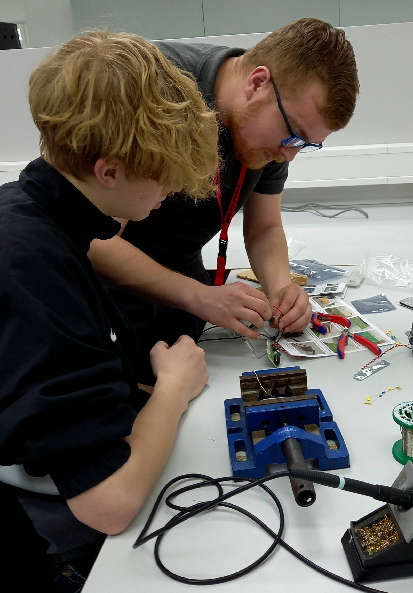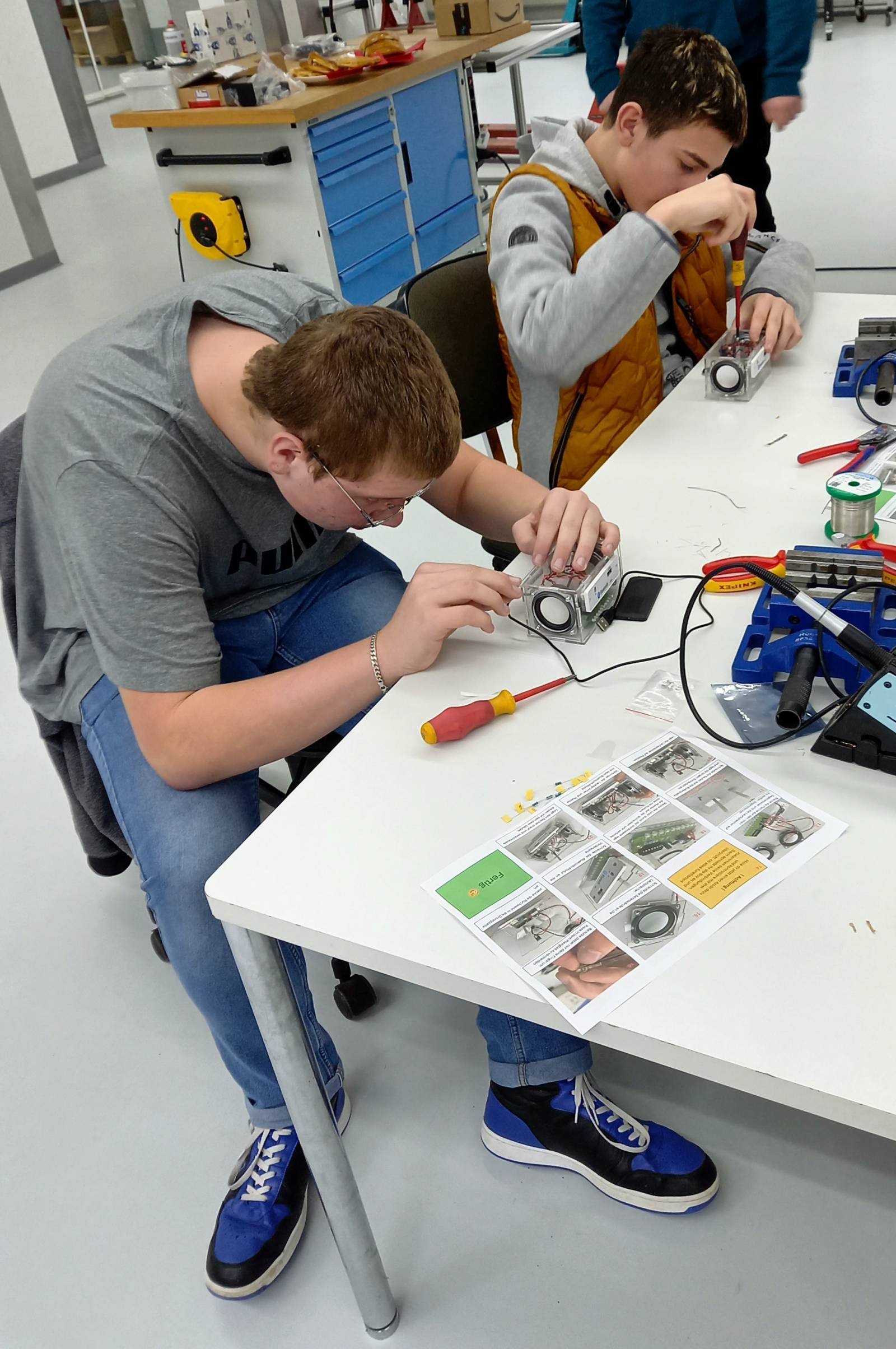 In kleinen Gruppen, jeweils begleitet von einem Azubi, wurde zunächst der Betrieb erkundet. Dabei verschafften sich die Jugendlichen einen Überblick zu allen Bereichen des Unternehmens. Im Anschluss starteten die Workshops. Verantwortet und begleitet wurden diese kompakten Praxis-Projekte erneut von kompetenten Azubi-Teams, die sich mit größtem Engagement und ganz viel Herzblut um die „Neuner“ kümmerten. Alle vier Workshops boten spannende praktische Aktivitäten, die umfangreiche Einblicke in das jeweilige Berufsbild ermöglichten. Zudem basierte das gemeinsame Tun auf Interaktionen und den beständigen Austausch mit den beteiligten Azubis. So konstruierten die Jugendlichen im Mechatronik-Workshop beispielsweise raffinierte Bluetooth-Boxen, die sie am Ende über ihre Mobiltelefone sofort testen und in Betrieb nehmen konnten.