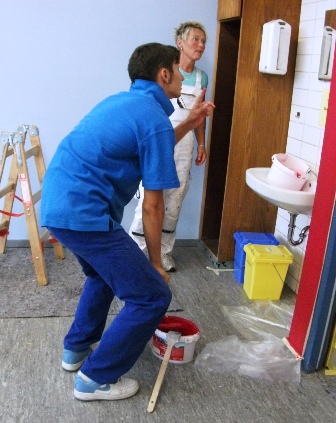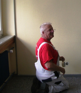 Ganz dem Motto seines alltäglichen Schaffens verpflichtet, führte Malermeister Hönig zu Beginn des Schuljahres mit den Schülerinnen und Schülern einen Workshop durch. Dabei wurde das Klassenzimmer der Neuntklässler farblich neu gestaltet. Die Jugendlichen entschieden sich nach einer kleinen Farbberatung für eine mutige Mischung aus Himmelblau, Orange und kräftigem Rot, während die Holzvertäfelungen mit dem Chic der 60er eine Auffrischung in Weiß erhielten. Schon bei den Abklebe- und Vorarbeiten wurde deutlich, dass das Malerhandwerk viel Genauigkeit benötigt. Aber auch die kreative Seite verlangte den jungen Malern einiges an Geschick ab. Heraus kam schließlich ein freundlich gestaltetes Klassenzimmer, das mit Sicherheit zu einer positiven Lernatmosphäre im Abschlussjahr der "Neuner" beitragen wird. Großer Dank geht daher an Malermeister Elmar Hönig, der die Schüler unter Verzicht auf Bezahlung und dafür mit manch klugem Ratschlag anleitete: Drei Dinge machen einen Meister: Wissen, können und wollen.