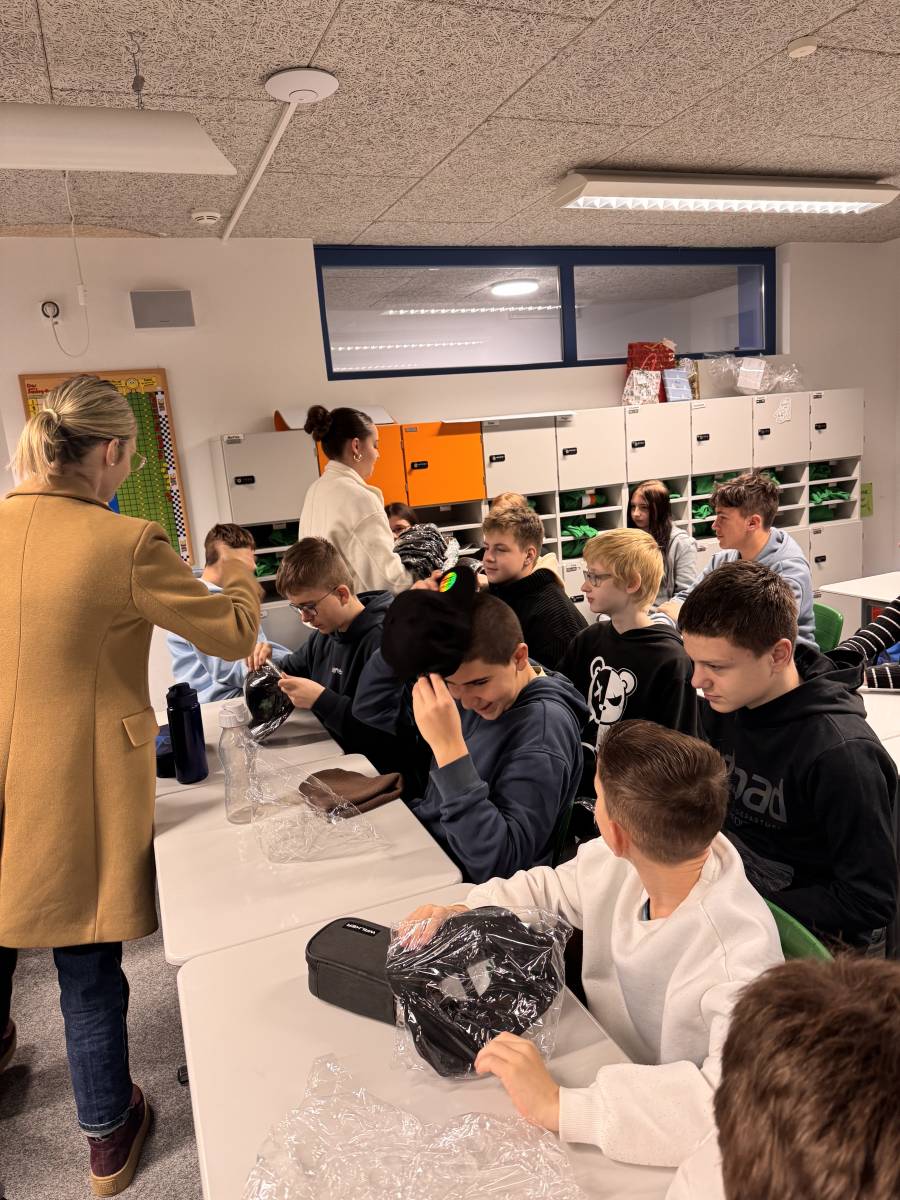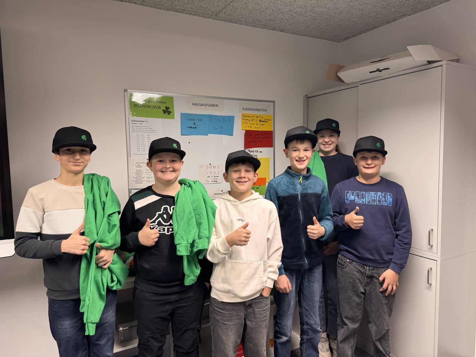 Am Freitag, 5. Dezember empfing die Irlandklasse einen besonderen Besuch:  Bianca Wäsche (Marketing) und eine Auszubildende (Industriekauffrau) von MS-Schramberg, Hauptsponsor und Schirmherr der Irlandklasse, kamen persönlich vorbei und überreichten den Schülerinnen und Schülern der Irlandklasse coole Cappies, bestickt mit einem irischen Kleeblatt (Shamrock).
