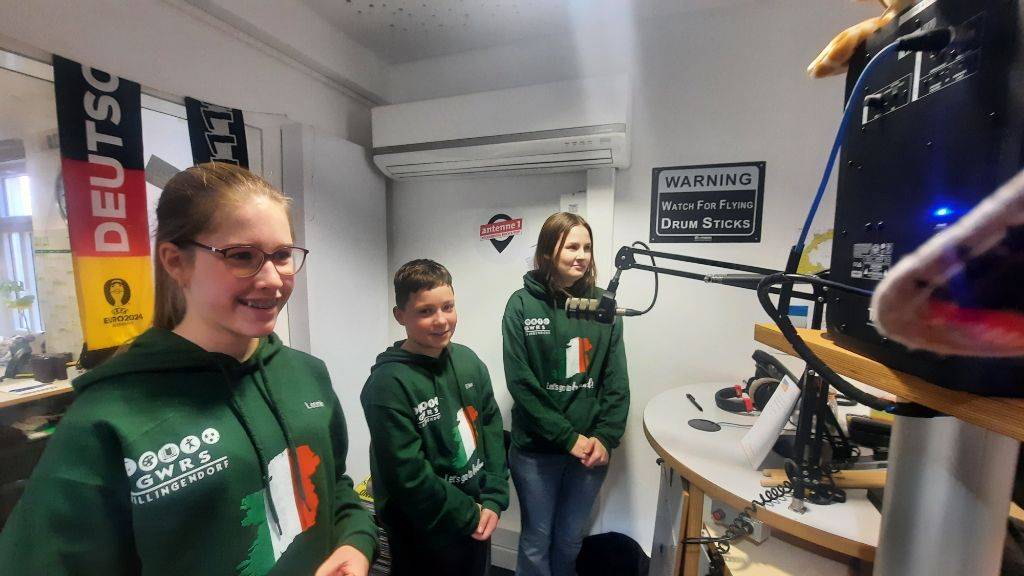Die Schülerinnen und Schüler von der Irlandklasse der GWRS Villingendorf waren zum Interview bei antenne 1 Neckarburg Rock & Pop. Dort standen sie Rede und Antwort zu ihrem Unterrichtsprojekt der Irlandklasse und dem anstehenden Konzert: Diesen Samstag, 29.03.2025 spielen „Restless Feet" in der Mehrzweckhalle in Villingendorf. Einlass ist um 18.30 Uhr, Konzertbeginn um 19.30 Uhr. Karten gibt es noch online unter www. irlandklasse.de, im Bürgerbüro der Gemeinde Villingendorf und im Schulsekretariat der GWRS.