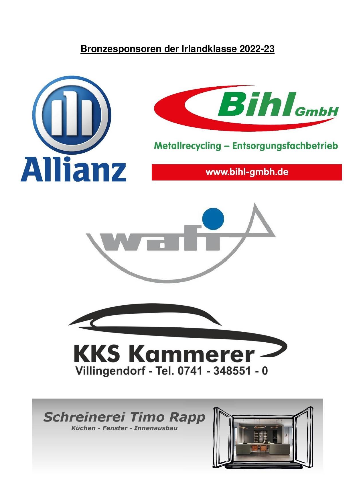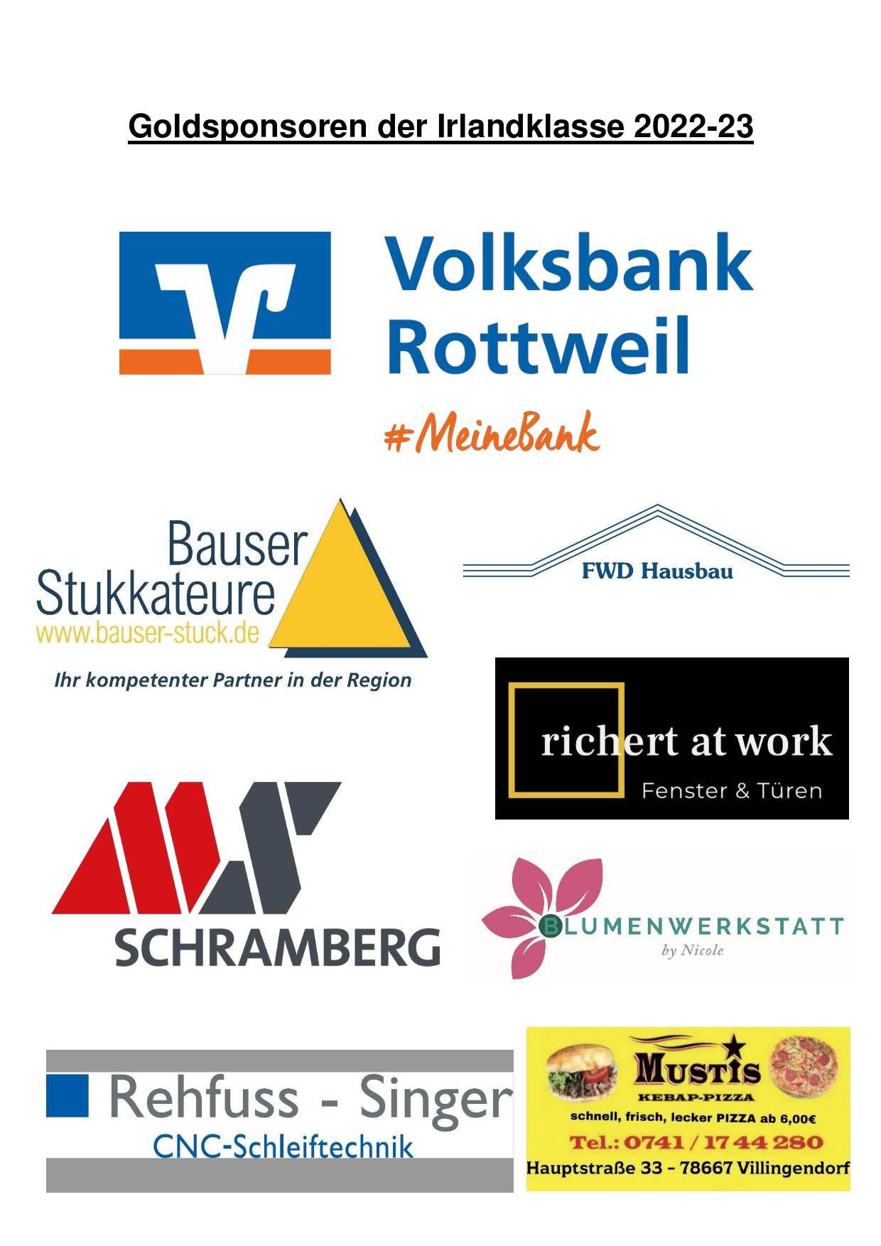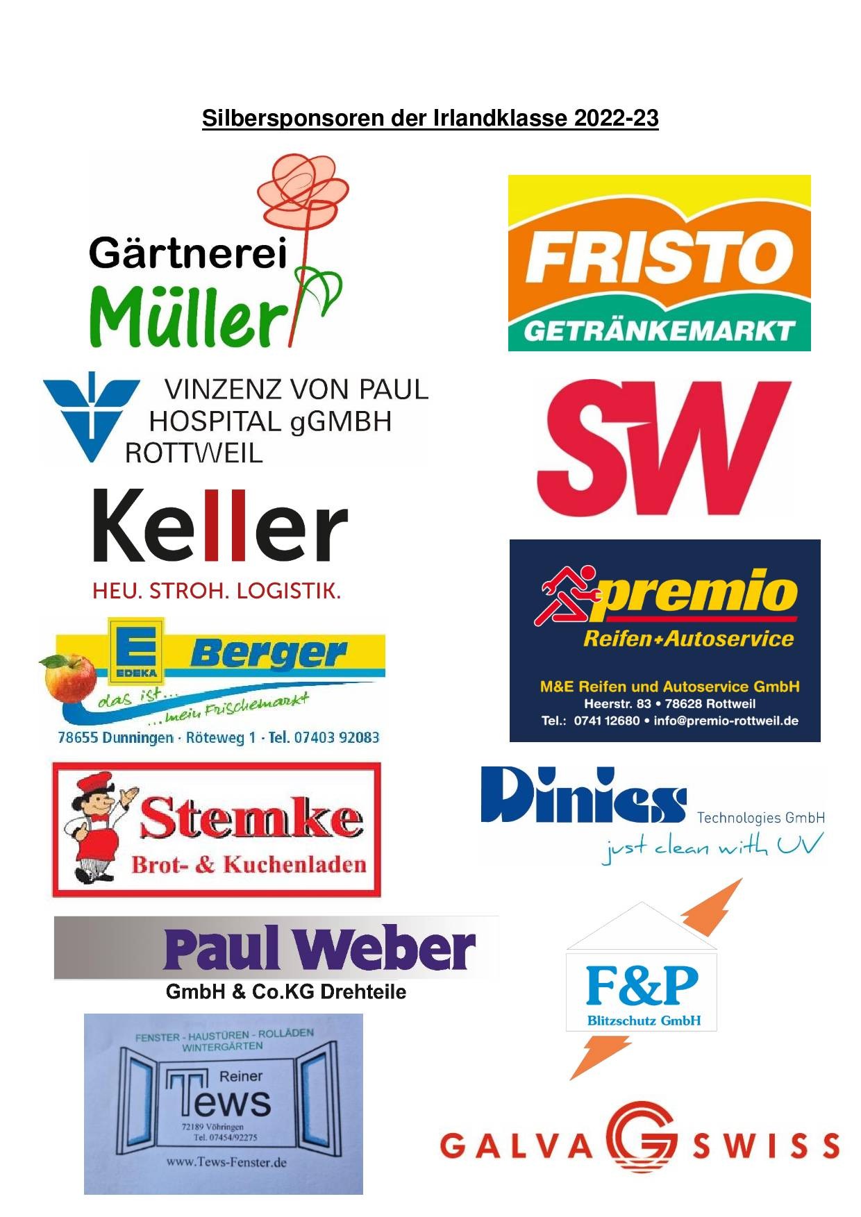 Geschrieben am 16. Januar 2023. Sponsorentafel der Irlandklasse 2022/2023 Die Irlandklasse 2022/23 bedankt sich herzlich bei allen Sponsoren für die Unterstützung auf dem Weg nach Irland.