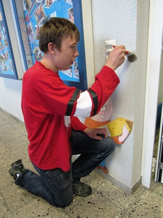 Wir bessern zum Beispiel Wände aus, um sie danach zu streichen. Dadurch setzen wir farbliche Akzente im Schulhaus. Wir bestücken die Rahmen und Glaskästen mit neuen Bildern, um immer ein aktuelles Bild der Arbeit an der Schule zu haben. Wir stellen kreative Bilder und Kunstwerke her, um sie im Schulhaus auszustellen und vieles mehr.